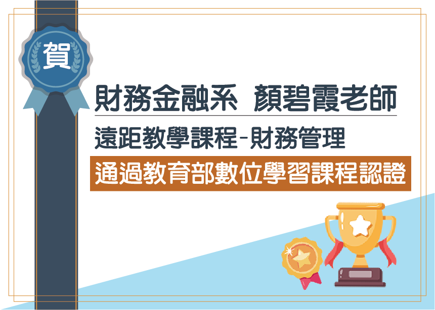 賀!財務金融系顏碧霞老師「遠距教學課程-財務管理」通過「教育部數位學習課程認證」