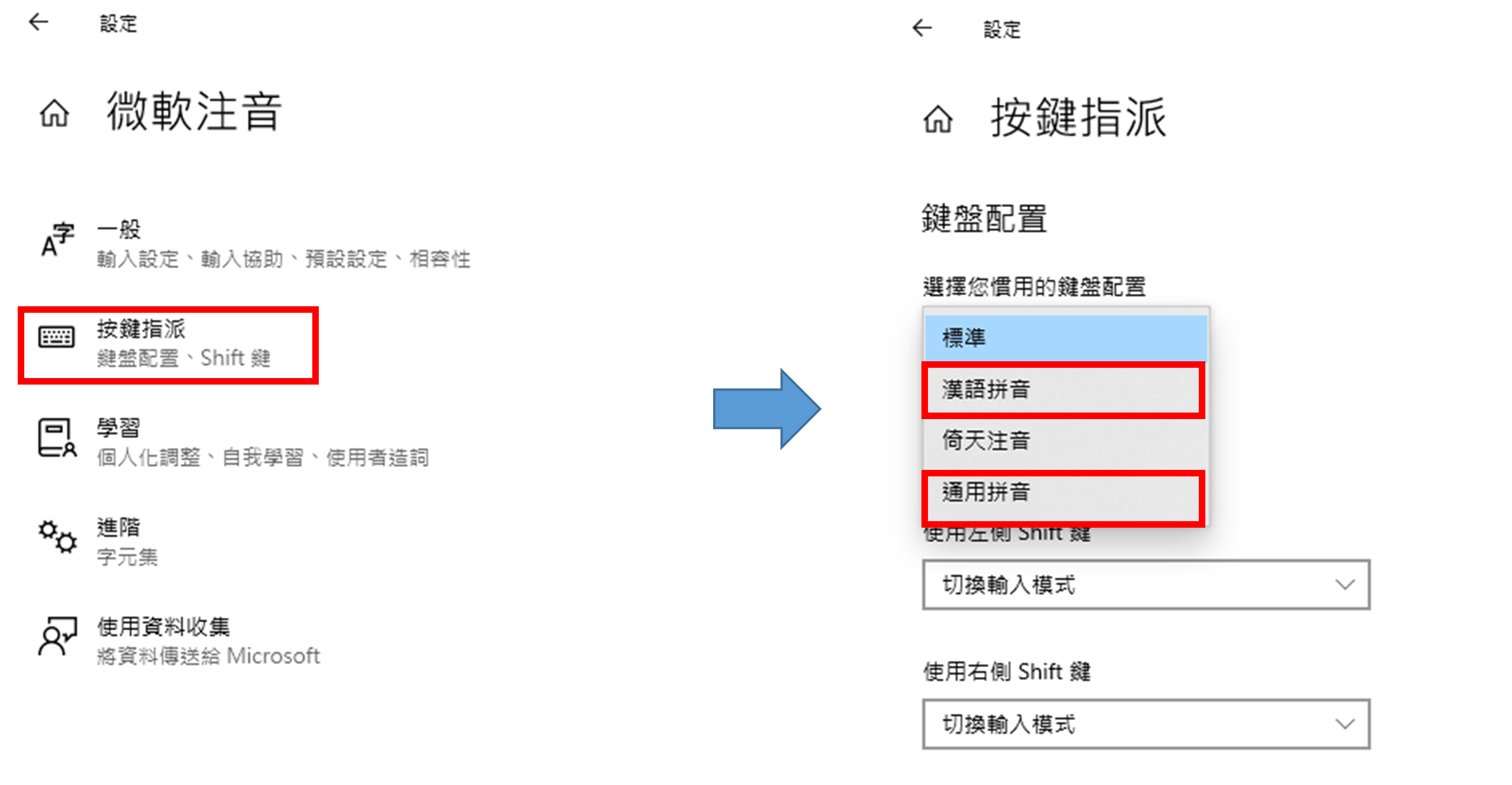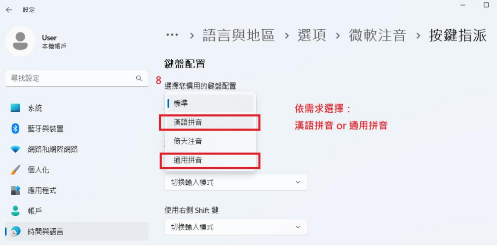 四、鍵盤指派將標準改為【漢語拼音 or 通用拼音】