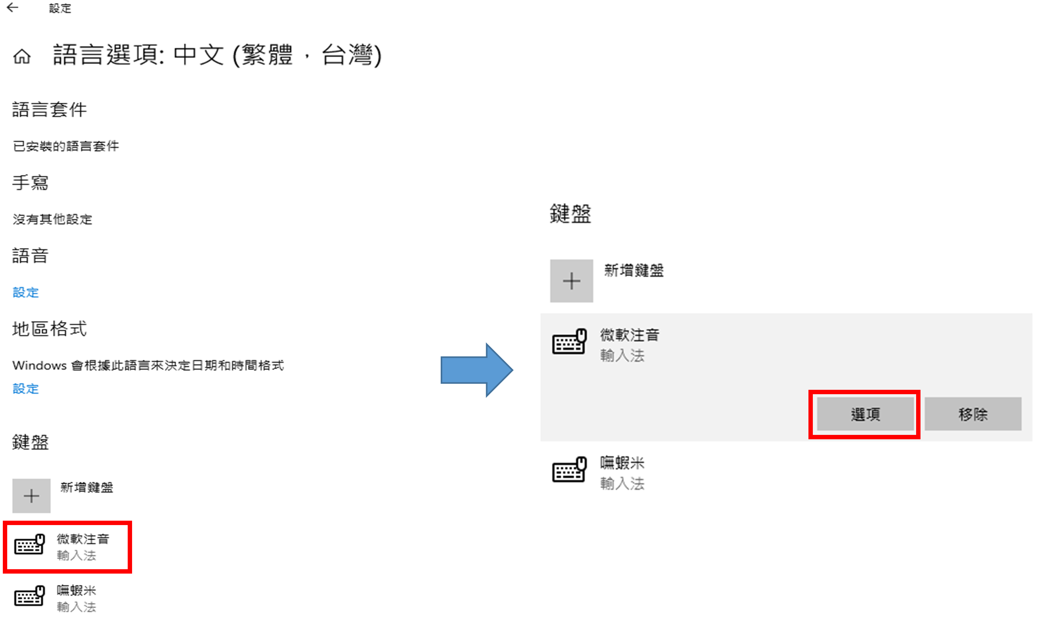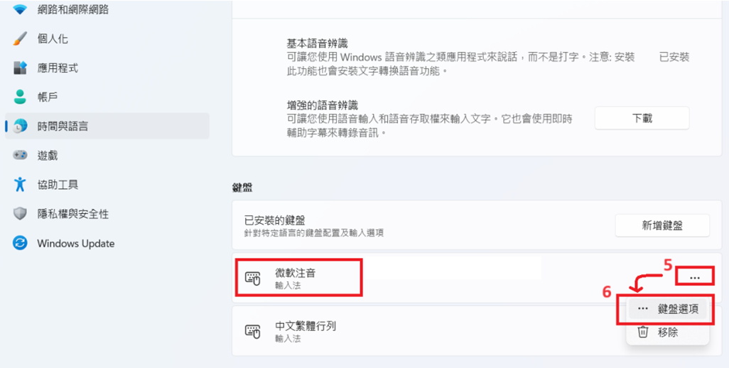 三、點擊【微軟注音】→【…】→【…鍵盤選項】